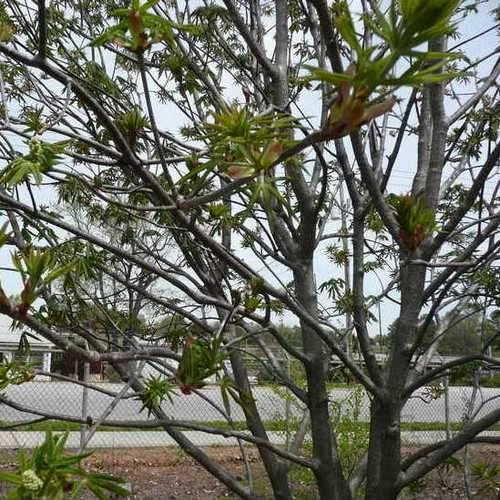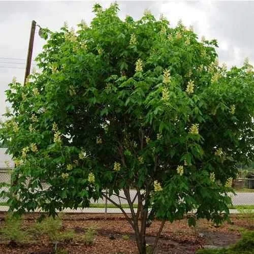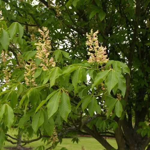 Related to the familiar horse chestnut, Aesculus x arnoldiana is a natural hybrid between three North American species. A large, deciduous tree, it has a much more open habit than the horse chestnut. Huge ‘candles’ of pale yellow flowers, marked with red and held clear of the leaves cover the tree in late spring, followed in autumn by green fruits, which split to reveal conker-like nuts. The leaves are large, and divided into leaflets; lime-green when young, they turn deeper green in summer and often show very good colour in autumn. Arnold’s Buckeye is tolerant of urban pollution, and makes a good specimen tree for a large garden.