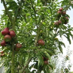 An old dessert apple from 19th century Massachusetts which has stood the test of time. Long, slightly conical, medium-sized fruit, flushed deep red; the flesh is yellowish, soft and juicy with a sweet, aromatic taste, best eaten soon after ripening. Apple American Mother is an upright, moderately vigorous tree, and a spur-bearer. Partially self-fertile, but crops much better with a pollination partner. Can be an erratic bearer. Good scab resistance, but susceptible to canker. A good choice for colder, damper parts of the country.