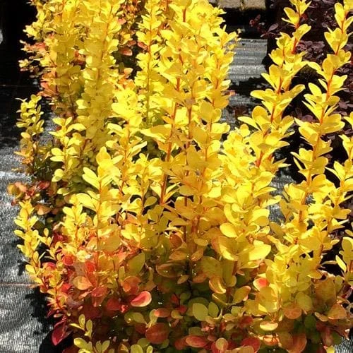 An unusual hybrid barberry, good as a hedge or a specimen, Berberis thunbergii Maria is a slow-growing, deciduous, dwarf shrub with an upright, bushy, columnar habit. The leaves emerge red and turn golden-yellow, a lovely contrast to the red stems, then lovely tints of red and orange in autumn. They do not scorch in hot sun, and retain their colour well, although they will turn greenish if grown in shade. Inconspicuous pale yellow flowers appear April–May, followed by small, red berries, very popular with birds. Also known as Sunjoy Gold Pillar, Japanese Barberry Maria is a much tougher plant than it looks, retaining its shape and colour all year long. Holds the RHS Award of Garden Merit.