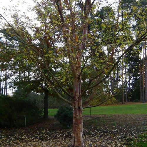 A superb, vigorous tree for year-round interest, Betula albosinensis Red Panda is a medium-sized to large, deciduous tree with an open conical crown. The bark is a deep coppery pinkish-crimson, peeling early to reveal a purple and grey beneath. The pointed, ovate leaves are deep green, turning butter-yellow in autumn. The dangling yellow-brown male catkins emerge with the leaves; unobtrusive female catkins appear at the same time. Chinese red-barked birch Red Panda is good for wild-life, and holds the RHS Award of Garden Merit.