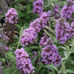 Buddleia is also known as the butterfly bush. Buddleja davidii Buzz Sky Blue is a compact, long-flowering, deciduous shrub, ideal for a patio or a small garden. The narrow elliptical leaves are an attractive grey-green. From June to September, conical heads of bright mauvish-blue flowers with a tiny orange eye are borne in profusion; the flowers are extremely attractive to bees and, especially, to butterflies. Buddleia Buzz Sky Blue is easy to grow, and does well in containers as well as planted at the front of a border. Prune to shape in early spring.