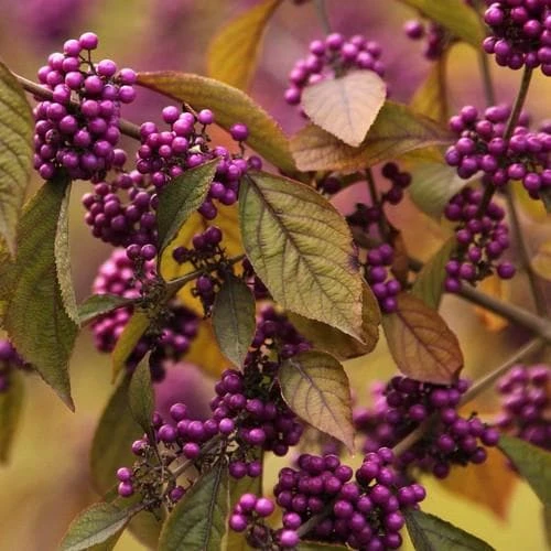 This selected form is very free fruiting, with conspicuous clusters of bright violet berries in Autumn. Small pale pink flowers in midsummer. The young foliage is bronze-purple, and makes good material for vases, as do bare branches laden with berries. The Royal Horticultural Society has given it its prestigious Award of Garden Merit AGM. If required, prune in early spring.