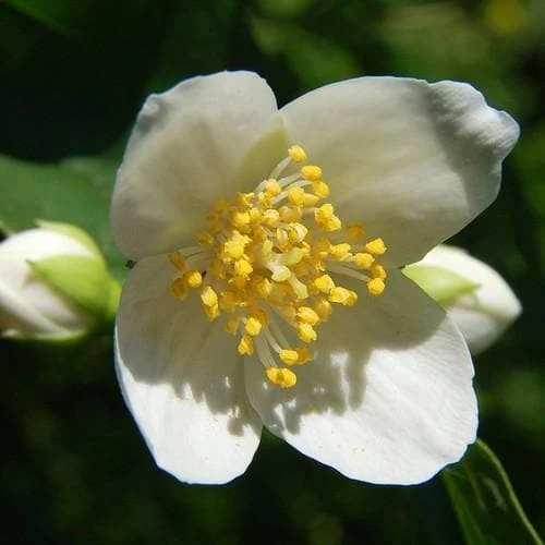 A bushy evergreen shrub with dark green glossy leaves. The bark is papery and peeling. Cup-shaped, fragrant, white flowers with yellow centres appear in Summer. In northern climates Carpenteria californica needs a mild, sheltered location to perform well, a warm wall is ideal.Â