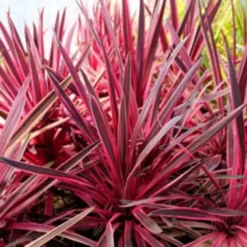 Grown for its brilliant colouring, Cordyline australis Pink Passion has long, linear leaves of purplish-grey streaked with shocking pink, magenta and cream. Unlike most cordylines, after developing its trunk to about a metre, it sprouts more stems from the base, maintaining a shrub-like appearance. Perhaps too bright to sit well in a garden planting, Cordyline Pink Passion is excellent in a modern, metal container as a patio plant. Mature plants in soil produce big panicles of white flowers in early summer; container-grown specimens rarely flower, but this is no disadvantage, preserving the clean lines of the leaves. Insulate pots and plant in winter if frost threatens.