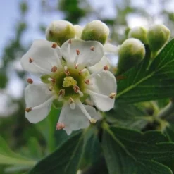 An improved cultivar of the Mediteranean hawthorn or azarole, Crataegus azarolus Geraki is a small to medium-sized, hardy, deciduous tree, up to 33’/10m tall, with white flowers in April and May which are good for pollinators. The fruit is like that of Irish whitethorns (haws) but larger and lighter red, with a pleasant, acid-sweet taste when grown in hotter climates. However, it does not ripen fully in Ireland, but it can be used for cooking and preserving. It has also traditionally been used as a heart tonic in herbal medicine. Can be grown as part of a fruiting hedge.