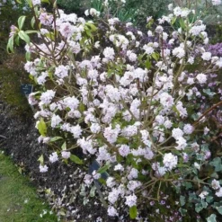 Grown for its scented blossom in late winter, Daphne bholua Jacqueline Postill is a medium-sized, slow-growing, semi-evergreen shrub with a slender, upright habit and oval, waxy, deep green leaves.  Clusters of wonderfully scented flowers, deep pink in bud and paler pink within, open from late January; these are followed by small purplish-black berries. Keep pruning to a minimum, and plant where its roots will be shaded. Lovely in a winter border with cyclamen, or near a gate or doorway where the scent can be appreciated, but be aware that all parts of the plant are toxic if eaten, and the sap is an irritant. Daphne Jacqueline Postill holds the RHS Award of Garden Merit.  All parts of the plant are poisonous to humans and a range of animals.