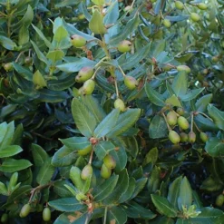 One of the few eucryphias which does not have to have neutral to acid soil, Eucryphia cordifolia is potentially a tall evergreen tree, sometimes a multi-stemmed tree or tall shrub with a strongly upright habit. The oblong, leathery leaves are deep, glossy green above, grey and felty below, and have slightly toothed edges. In late summer, scented, white, four-petalled flowers, nearly 2”/4-5cm across, with a ring of terracotta stamens, are usually alive with bees, who produce a particularly nutritious manuka-like honey from them. Ulmo does particularly well in damper, milder parts of the country; it needs protection from strong winds, as the branches are fragile, and prefers to have its roots shaded and its head in the sun.