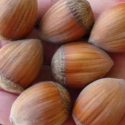 This old, late-season variety of cultivated hazel, Corylus avellana ‘Hall’s Giant’, also known as Merveille de Bollwiller, originated in France, and despite its name, grows as quite a compact bush. It was named for the size of the nuts, although these are a bit smaller than those of some modern varieties. Very vigorous and exceptionally reliable, bearing heavy crops of large, rather pointed, glossy brown nuts with an excellent flavour, whether eaten fresh or from store. Highly nutritious source of high-quality protein, ‘good fats’, fibre, Vitamin B, folate, iron and other minerals. Harvest as they start falling from the tree. Eat fresh, or dry the crop carefully, then remove the husks and store in a mouse-proof place. Filbert ‘Hall’s Giant’ was the best performer in trials by the Agroforestry Research Trust in Devon.  A good choice where weather conditions are poor, and an excellent pollinator of other later-flowering hazels. Attractive catkins with a red tinge in late winter.