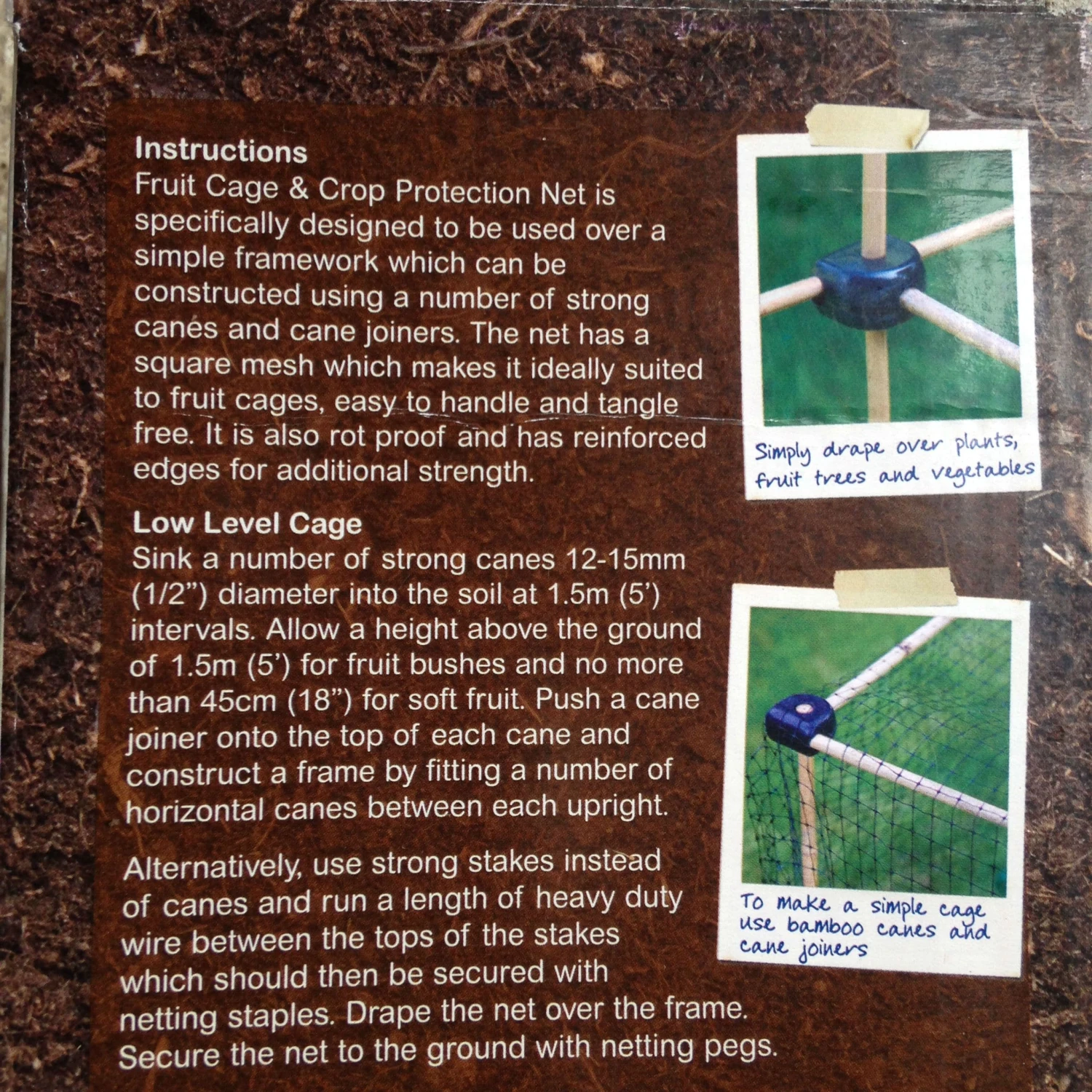 This fruit cage and crop protection net is specifically designed to be used over a simple framework which can be constructed using a number of strong canes and cane joiners. The net has a square mesh which makes it ideally suited to fruit cages, easy to handle and tangle-free. It is also rot-proof and has reinforced edges for additional strength.