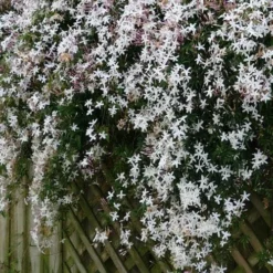 A vigorous twining climber, deciduous with pinnate leaves. Jasmine bears intensely fragrant, white, star shaped flowers from early to late summer. Jasmine is best grown in full sun for the strongest fragrance but will do well in partial shade, it needs support to climb up to its full height of 12 ft.