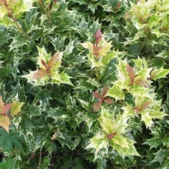 A good shrub for year-round interest, Osmanthus heterophyllus Goshiki is a medium-sized, slow-growing, evergreen shrub with a bushy habit. The leaves are spiny and holly-like, glossy green marbled with shades of cream, tinged pink and bronze when young (Goshiki is Japanese for ‘five colours’). In late summer and autumn, fragrant white flowers, strongly scented of apricot, are borne in the leaf axils; these are  followed by small black berries. Not for the coldest areas, holly olive Goshiki holds the RHS Award of Garden Merit.