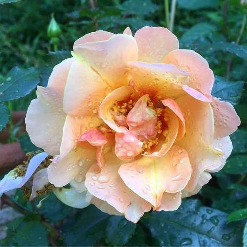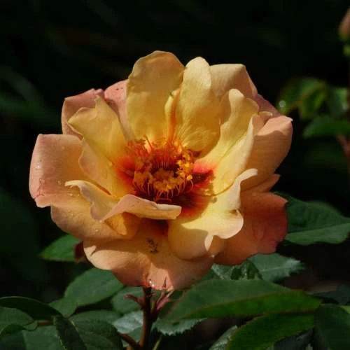 A very pretty, often diminutive, hybrid of Rosa persica with the characteristic persica dark eye, Rosa persica Persian Sun is a small, deciduous, repeat-flowering shrub rose with a compact, dome-shaped habit and glossy, grey-green foliage. From June to October, the plant bears flushes of semi-double, peach-coloured flowers with a deeper eye and golden-yellow stamens; the innermost petals are shorter, giving a very pretty, rather anemone-like effect, and the fragrance is light. Shrub rose Persian Sun is a tough, very healthy rose, and tolerates drought once established. Itβs perfect in soil-based compost in a large container, or at the front of a sunny border. Easy to grow and disease-resistant.