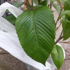 A recently discovered plant from the eastern Himalayas, Rubus calophyllus is a medium-sized, suckering, semi-evergreen shrub named for its beautiful leaves. These are ovate and pleated, up to a foot/30cm long, deep green above and silvery-white beneath, with serrated edges. The arching stems are whitish, with small, recurved, prickles. Deep wine-red flowers, ¾ “/1.5cm across, are borne in May and June, and are followed by red berries.