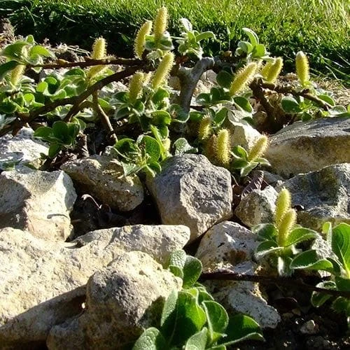From mountainous parts of the Japanese island of Hokkaido, Salix nakamurana var. yezoalpina is a ground-covering, deciduous, prostrate shrub with long, spreading stems which root as they go – they can be easily cut back if they exceed their allotted space. The deeply veined, ovate leaves emerge covered with silky white hairs, and mature to glossy green, turning yellow in autumn. The silky, yellowish catkins are held upright, and are borne in spring. The Yezo dwarf willow is a good ground-cover plant for a bank, as long as the soil is cool and moist.