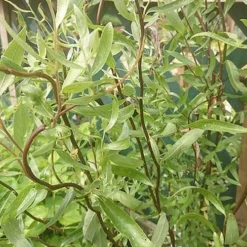Grown for its contorted, deep green, winter branches, twisted foliage and year-round interest, Salix x sepulcralis Dart’s Snake is a small, fast-growing, deciduous tree with an upright habit. The snaking branches show at their best in winter, while the narrow, glossy, mid-green leaves are also slightly twisted. In spring, yellow catkins dangle from the bare branches. Because of its wonderfully twisted branches, twisted willow Dart’s Snake shows best as a specimen tree, or as part of a border where it can take centre stage in winter. It can be pruned hard to keep it to size, and the prunings make striking ‘flower’ arrangements.