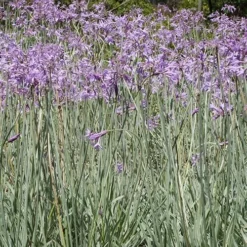 Looking rather like a refined agapanthus, Tulbaghia violacea Variegata is a clump-forming, rhizomatous perennial. It forms a foot-high (30cm) clump of grassy leaves, blue-green edged with creamy-white, giving a bright, airy appearance. The foliage smells strongly of garlic if brushed against. In August and September, tall stems bear pretty, delicate umbels of lilac-coloured flowers, tubular, flaring to a starry mouth; they are attractive to bees. Variegated society garlic is not for cold areas, but in mild areas may survive winter if planted in the shelter of a warm wall and given a deep dry mulch. It can also be grown in pots brought into a frost-free greenhouse for the winter.