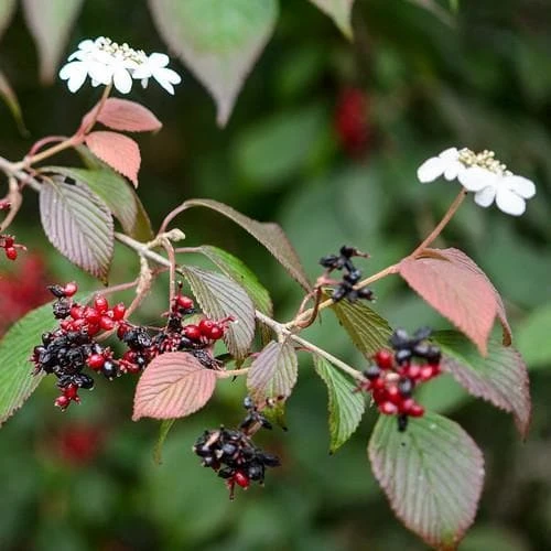 A fantastic broad spreading cultivar. When young it forms a beautiful upright growing clump, but in a few years it will begin to grow upright, forming an interesting lightly weeping shape. Profuse flowering with white-tinged pink flowers borne in umbrella-shaped inflorescences, giving way to an equally impressive display of deep red fruits in the fall, and can often be seen flowering and having berries simultaneously.Â